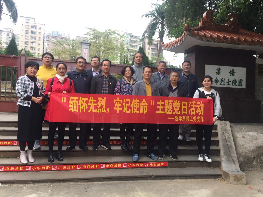 为深入学习贯彻党的十九大精神,切实用习近平新时代中国特色社会主义思想武装头脑、指导实践,扎实推进党建工作,2018年12月8日,数学系教工党支部组织全体党员前往广州湾支部旧址开展以“缅怀先烈 牢记使命”为主题的党日活动。