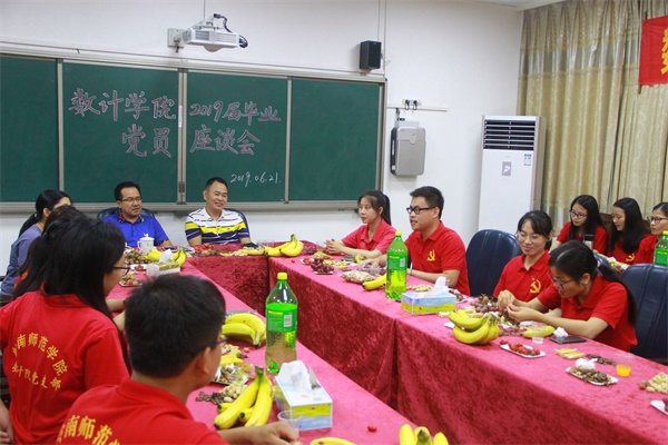 6月21日,数计学院党委于榕燕楼会议室召开2019届毕业生党员座谈会,畅叙师生情谊,共谋母校未来发展。参加本次座谈会的有数计学院党委书记李健彬、副书记唐洪浪、辅导员代超群及35位毕业生党员。
