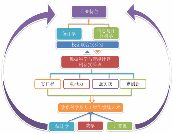 信息与计算科学和统计学专业,学院以“数据科学与智能计算”升级校企联合实验室为平台,构建了“以赛促学、以赛促教、以赛促研”的学科交叉性人才培养模式。学院借助于创新创业实践活动,要求在校学生至少参加一项学术创新或学科竞赛活动,如“互联网+”、“挑战杯”、数学建模竞赛、市场调查与分析大赛和数据挖掘挑战赛等,并将这些赛事的指导和培训及赛后延伸研究纳入到综合实践教学之中,形成“教学、竞赛、科研”三位一体的实践教学体系,从而促进创新型复合人才的培养。进入创新实验班且表现优秀的学生,学院层面成立院级研发项目团队,并筹措经费进行项目资助。每个团队由2-3名老师、8-12名学生组成,学生来自两个专业的大二、大三和大四3个年级,实行滚动进出制。该措施从2022年开始实质性实施,目前已有两个项目研发团队做出了成绩:主持研发的学院竞赛管理系统和教学项目管理系统已成熟并投入试运行。