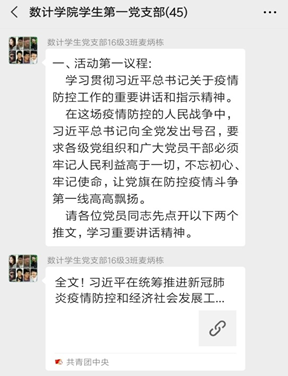 为深入学习贯彻习近平总书记对新型冠状病毒的肺炎疫情防控工作的重要指示精神,增强支部党员在此次战“疫”中的责任意识,坚定信心打赢这场防控疫情阻击战,4月8日晚,我院学生第一党支部开展“党课开讲啦”线上党日活动。党支部书记付怡老师及全体党员参与活动,党支部党员张韵主持。