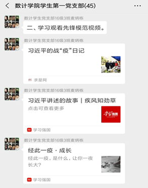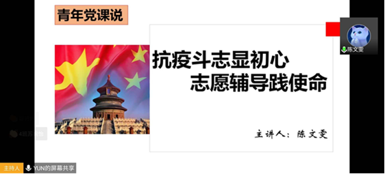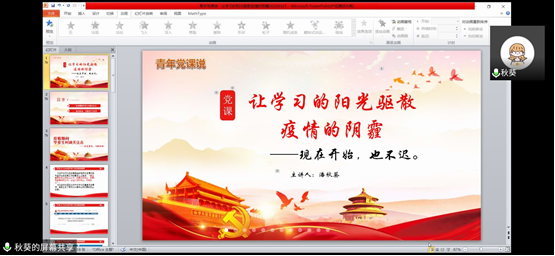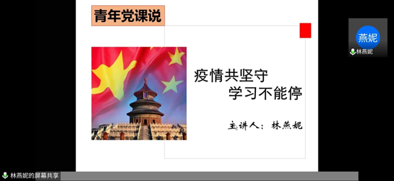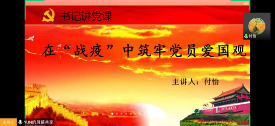 为创新线上党日活动形式,聚焦时事热点,由支部书记和3名学生党员分别进行“书记讲党课”和“青年党课说”。付怡以“在‘战疫’中筑牢党员爱国观”为主题给支部党员上了一堂深刻而有意义的党课。结合当前形势就"什么是爱国?"以及"为什么要爱国"两点为党员同志们进行了详细深刻而有意义阐述。并对学生党员提出三点希望,一是坚定信念,勇担使命;二要以疫为鉴,励志勤学;三是发挥作用,榜样引领;在进行“青年党课说”过程中,陈文雯以“抗疫斗志显初心,志愿辅导践使命”为主题,分享了作为一名中共党员如何在疫情期间发挥党员的先锋模范作用;林燕妮以“疫情共坚守,学习不能停”为主题分享了疫情期间考研复习心得;潘秋葵以“让学习的阳光驱散疫情的阴霾”为主题向支部党员讲授了一堂在疫情期间就业考编的党课。