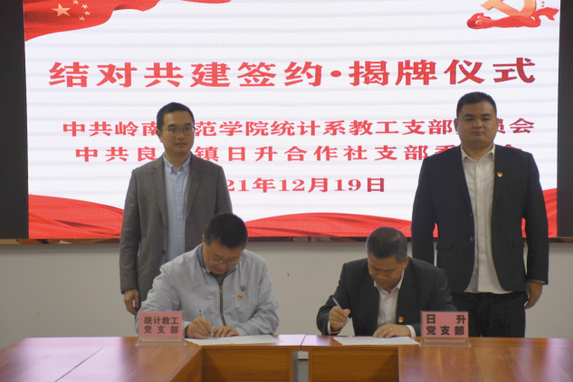 致辞之后,岭南师范学院统计教工党支部与中共良垌镇日升合作社支部委员会签署共建协议并进行揭牌仪式。