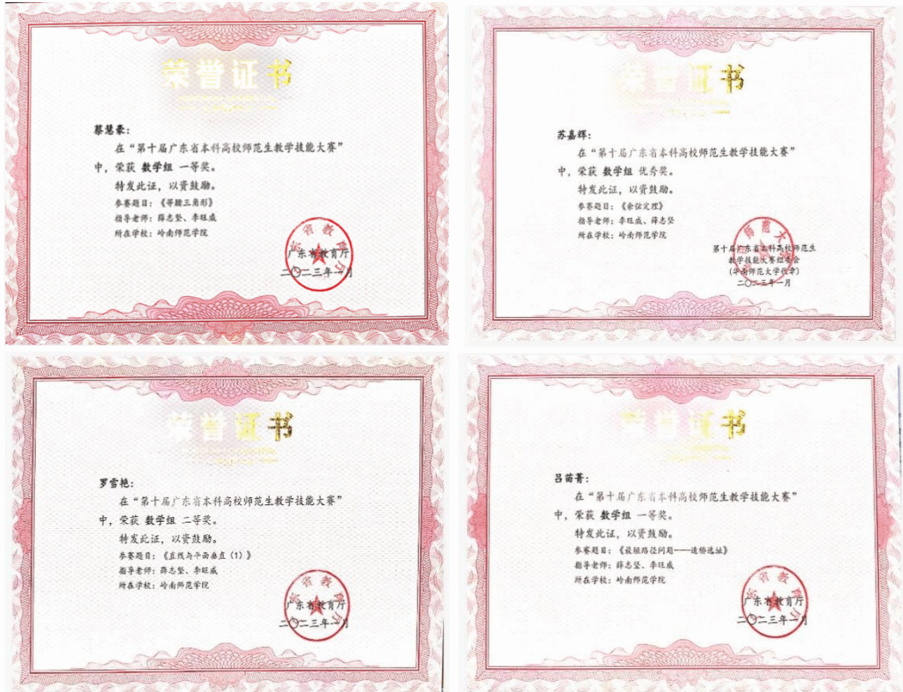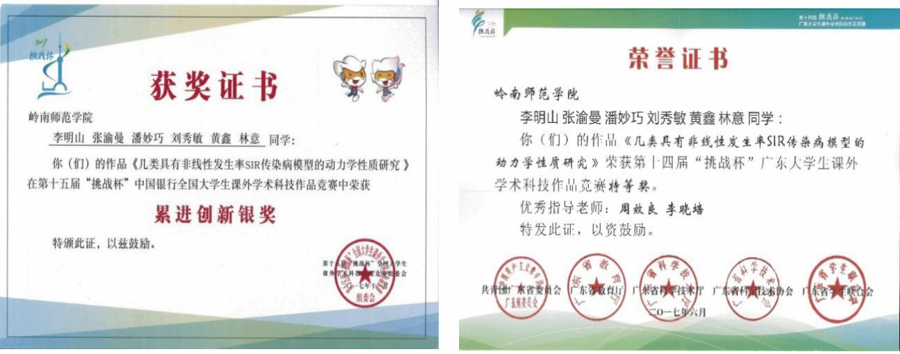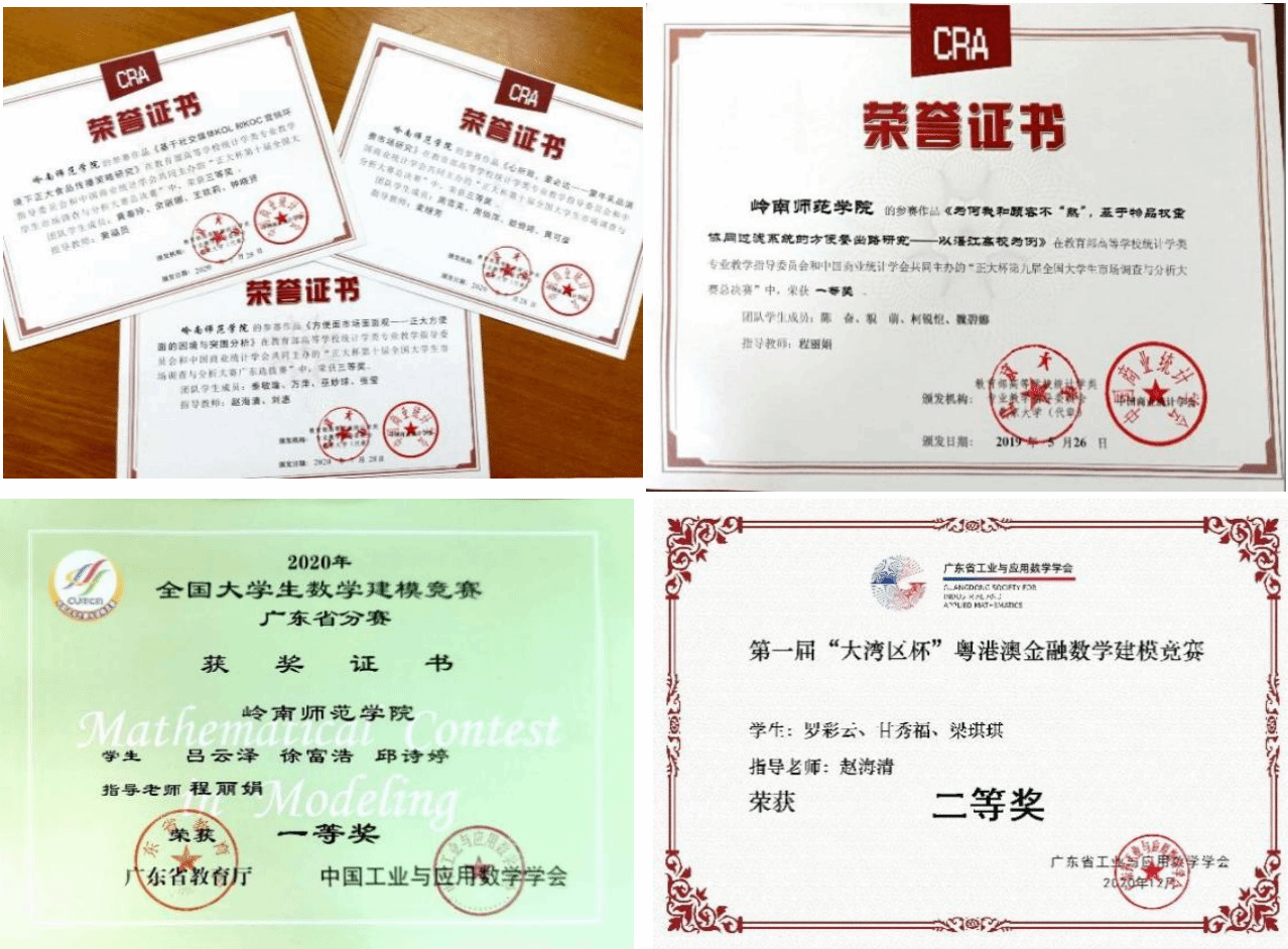 卓越人才和创新型人才培养模式的成功实施,学生的创新和实践能力得到明显提升,学院人才培养质量和学科竞赛成绩显著。2017年以来,我院学生获全国“挑战杯”大学生课外学术科技竞赛国家二等奖3项、国家累进创新银奖1项和铜奖2项,广东省特等奖3项;获广东省“挑战杯”创业计划大赛金奖、银奖5项;先后在全国大学生数学建模竞赛、全国大学生数学竞赛和本科高校师范生教学技能大赛等竞赛中获省级以上奖项200余项;发表学术论文30余篇。每年有30名左右学生考取硕士研究生。2020—2023年,我院学生连续参加广东省师范生技能大赛,共获得一等奖10项、二等奖2项、三等奖3项的好成绩(注:该赛事数学学科每个学校每年只有4个参赛名额,全省一等奖的设置每年只有6个名额),总成绩排全省数学组第一名。2021年,获美国大学生数学建模竞赛(MCM)一等奖1项、二等奖1项,实现了我院学生参加国际大赛战绩零的突破。