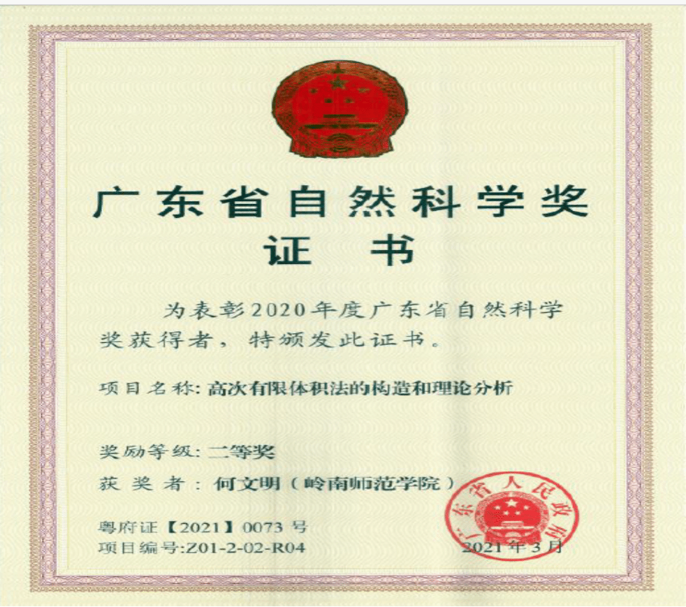 1 | 何文明 | 界面问题的高效虚拟有限元法 | 43.5 | 国家自科基金 | 面上项目 | 2024.01-2027.12 |