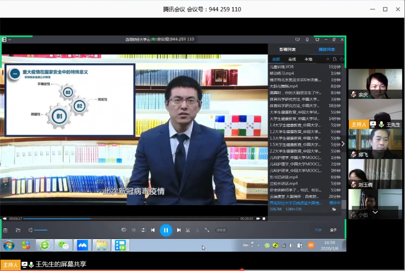接下来,全体观看了西南财经大学云端课堂大国情怀主题为《共同战“疫”:新冠疫情防控中的中国责任与全球合作》的讲座。大家认为讲座使全体对社会、生态、公共卫生、虚拟空间以及非人类行为体等的入侵等非传统方式的安全风险有了更深刻的认识。刘玉倩教授认为,在当前复杂的国际形势下,我们不仅面临着传统的安全风险,更面临着一些非传统的安全风险,我们要具有高度的政治责任感,举国上下同心戮力。卜秋香同志说,当代,安全与以往不同,一方面我们要时刻保持警醒、理性看待、不断学习,用科学武装自己,科学防范安全风险、科学防疫,另一方面也要具有大国情怀,承担更重要的国际责任。