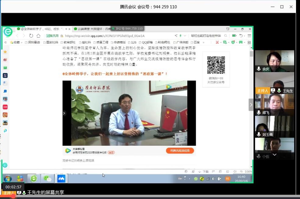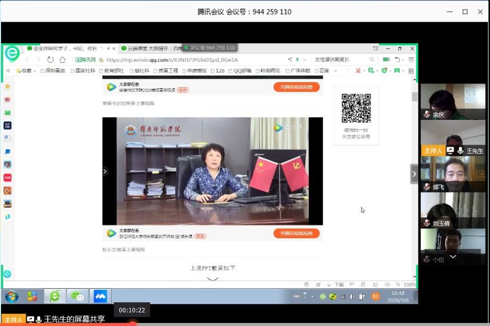 学习活动伊始,全体观看了学校书记、校长思政第一课的视频。邱飞书记说道:“身为教育工作者,我们担负着立德树人、教书育人的重任,我们要将学习教育和体会认识,传导给我们的学生,就如刘书记、兰校长要求的,要教育引导我们的学生从战‘疫’中汲取成长的力量,树立正确的人生观、价值观和世界观,认识和领悟我们中华民族的伟大团结精神和家国情怀”。刘玉倩教授说道:“听了刘书记和兰校长的报告,深刻感受到作为一名岭师人,在疫情面前要从我做起,做好本职工作,有责任担当,也要利用上网课的机会教育学生居家要做好防护,同时引导学生和家人做好宣传,在社区和村庄承担起应有的职责。”伍骅旻说道:“今天观看第一课,深刻感受学校对师生的关心,在疫情防控关键时刻,小到小家,大到国家,都要提高防疫意识,照顾好家庭,做好居家防护和本职工作”。