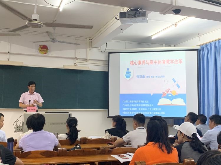 下午,广东第二师范学院院长张细谦教授向学员们讲述了《核心素养与高中体育教学改革》。张教授在课上展示了新时代四好老师的要求:1.有理想和信念。2.有道德情操。3.有扎实的学识。4.有仁爱之心。向老师阐述了“立德树人”的根本任务和学科核心素养的基本内涵。另外,张教授还向学员介绍了如何开展高中体育选项,并为学员提供了解答。