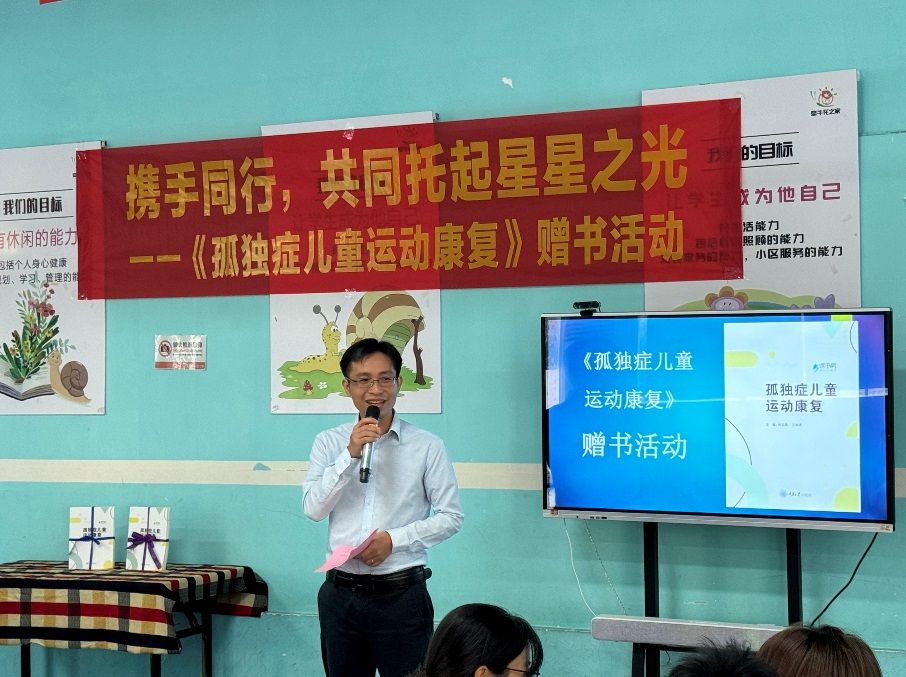11月23日下午,为了加强运动康复专业与特殊儿童及家庭和康复机构合作,强化专业服务社会的能力,岭南师范学院体育科学学院院长王海涛教授带领团队,到湛江经开区牵牛花之家儿童康复中心(一下简称“牵牛花之家”)开展交流合作,并向牵牛花之家捐赠《孤独症儿童运动康复》教材。运动康复系副主任余庆、运动人体科学研究团队负责人刘玉倩教授、学生代表和牵牛花之家家委会代表出席了赠书活动。