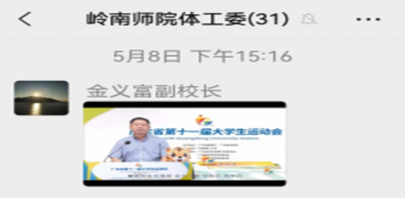 2022年5月8日,广东省第十一届大学生运动会开幕式以线上播出方式举行。广东省教育厅党组书记朱孔军宣布运动会开幕,广东省教育厅二级巡视员邱克楠、华南理工大学党委书记章熙春致辞。来自华南理工大学、华南师范大学和广州体育学院的600余名师生参与开幕式文艺演出。岭南师范学院体育工作委员会、校团委、体科院组织学生线上观看开幕式盛况。