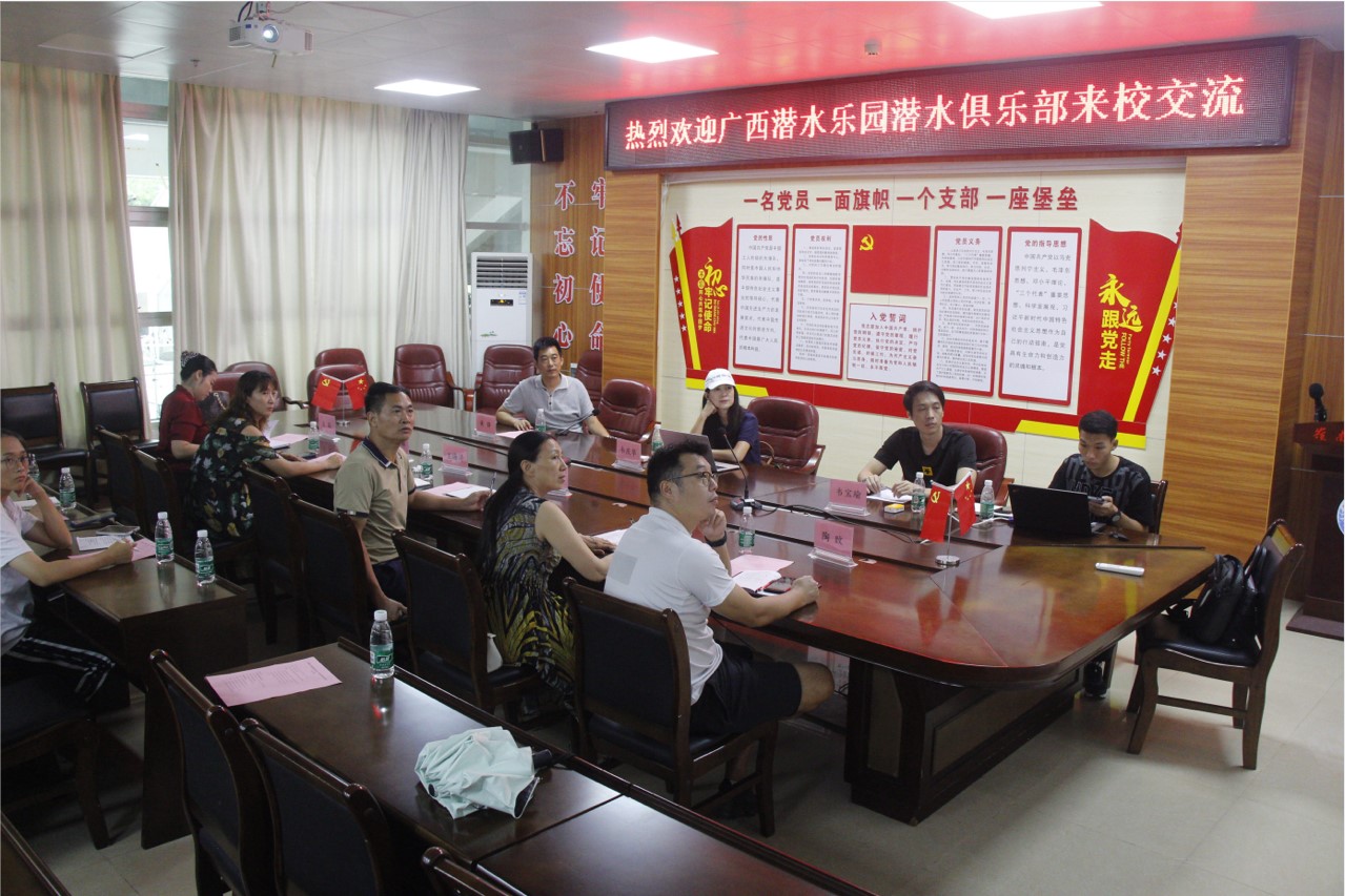 6月27日下午三点,在体科院体育馆会议室召开广西潜水乐园潜水俱乐部岭南师范学院交流会议程。由广西潜水乐园潜水俱乐部韦庆华(单位法人、亚潜院校外实习指导教师)、单位副总经理韦宝瑜、潜水平台网络主管黄锋、体科院党委书记庞景才、副院长王海涛(主持)、社体系主任谢琴、社体系副主席陶盿、朱晓娜(常务)、体操舞蹈教研室主任王聪参加会议。会议由庞景才主持。