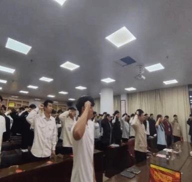 12⽉22⽇晚,体科院团委于体育馆会议室召2024-2025学年第⼀学期新发展团员⼊团仪式。出席本次会议的有团委指导老师张家源、院团委副秘书长冼⼩清、团委干部、各位团支书以及70名新发展团员。本次会议由杨樱桃同学主持。