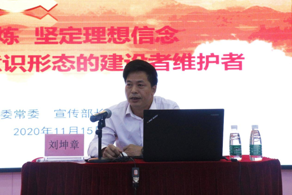 刘坤章以“加强思想淬炼,坚定理想信念,自觉做社会主义意识形态的建设者维护者”为主题。他围绕三点展开本次培训,首先,学习领会《习近平谈治国理政》第三卷的精髓要义,努力成为担当民族复兴大任的时代新人;第二,加强思想淬炼,坚定理想信念,坚持用习近平意识形态思想统领思想行为;第三,认清形势使命,增强意识形态能力,自觉做社会主义意识形态的建设者维护者。他强调学员们要系统深入地了解高校意识形态工作的重要性和紧迫性,做到为党育人,为国育材。