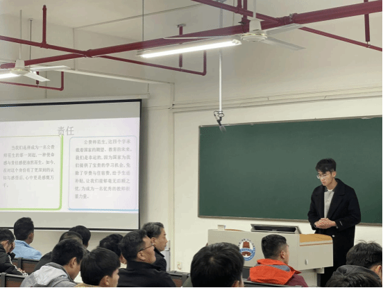 公费师范生实习代表杨锡聪分享了作为公费师范生实习的感悟以及乡村教育的特殊性,尤其是在教学资源严重匮乏时,实习生应如何及时调整教学策略等问题。集中实习学生代表李咏芯同学结合自身经历,讲述了在班级管理、家校沟通中的挑战与突破。
