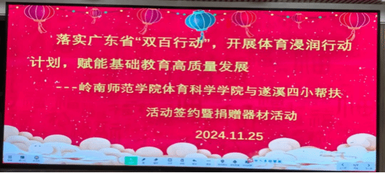 初冬已至风微凉,爱心传递正当时。为了落实广东省“双百行动”,开展体育浸润行动计划,赋能基础教育高质量发展,推动我校体育工作迈向新的台阶,11月25日,岭南师范学院体育科学学院与遂城第四小学帮扶签约暨捐赠器材活动在遂城第四小学举行。