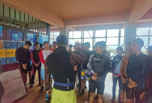 二、午饭稍作休息后,下午2点30分,开展开放水域适应性训练,25名同学分为5小组由5名教师分别带队,时间安排为两个半小时两潜;在训练前集体集中,老师领导分别作了训练安排讲解和安全教育。
