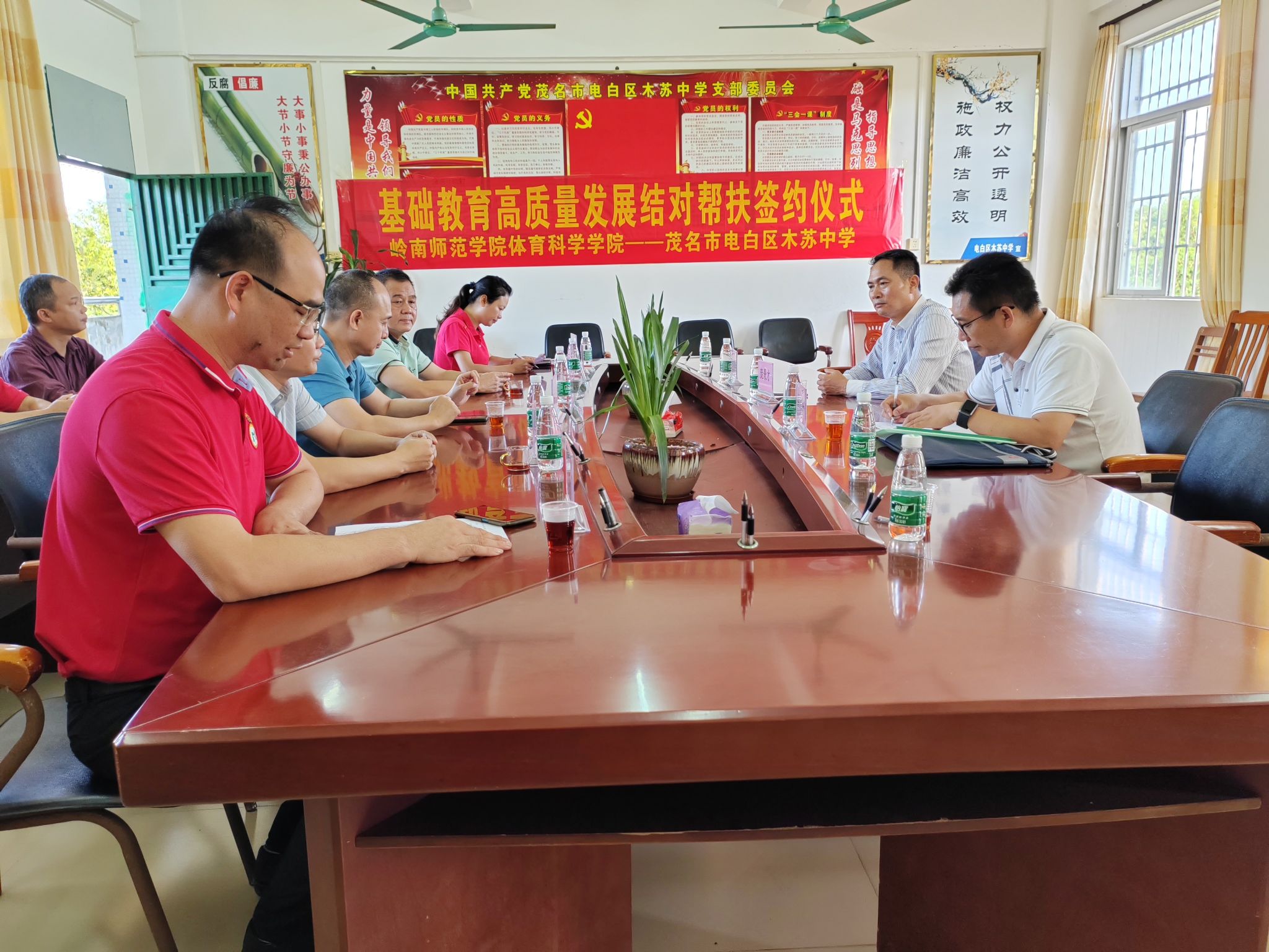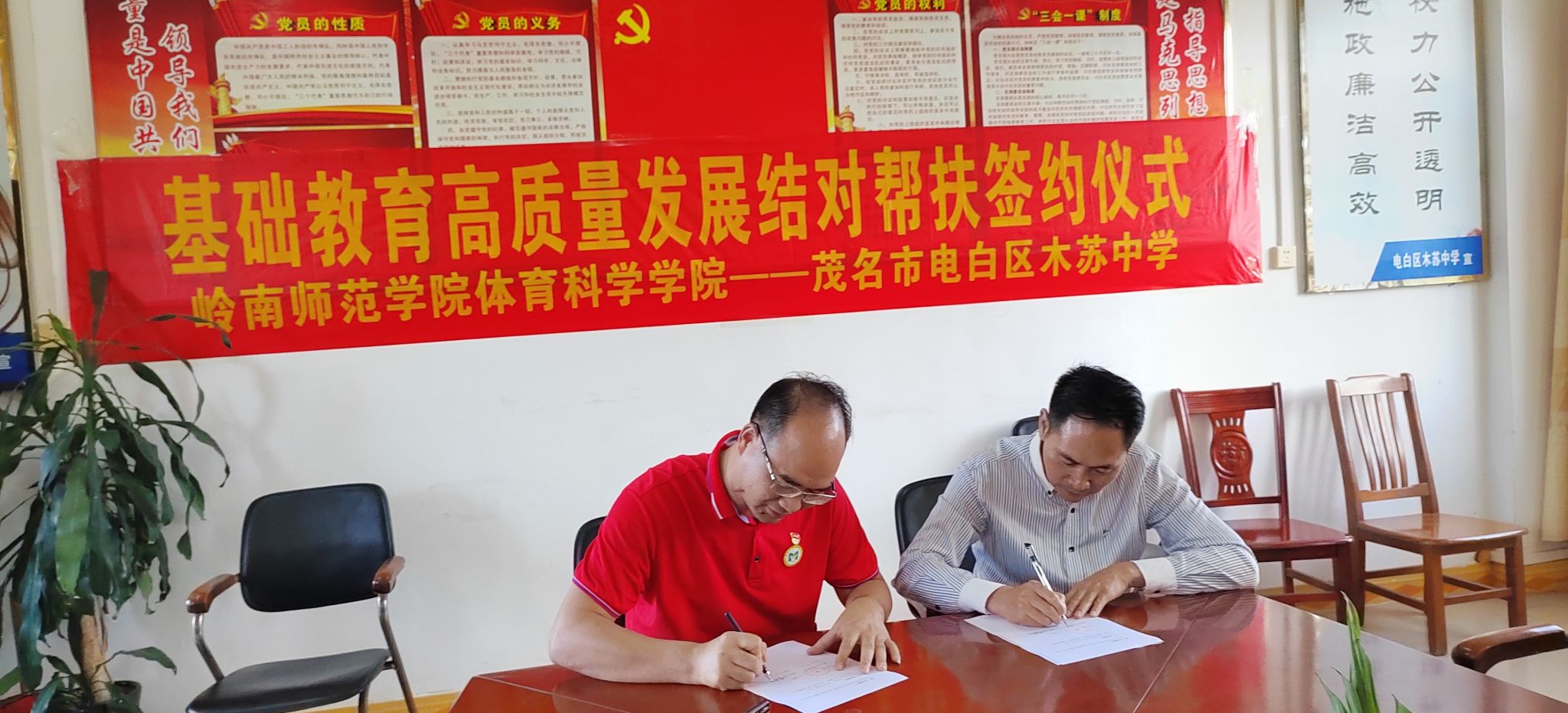 为深入贯彻中央关于建设高质量教育体系的决策部署,全面落实省委、省政府关于推动基础教育深化改革高质量发展的工作要求, 10月26日,岭南师范学院体育科学学院党委书记庞景才、副院长梁立启、社会体育系副主任朱晓娜等人来到茂名市电白区木苏中学,与该校签订基础教育高质量发展结对帮扶协议,并开展送教至校大型教学活动。茂名市电白区教育局人事股股长王振江、体卫艺股股长谭论、电白区教师发展中心教研部教研员陈小平、木苏中学校长曾宪法以及学校领导班子出席签约仪式并观摩送教活动。