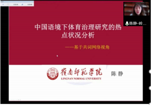 5月8日下午,获得一等奖的参会代表分成6个分会场进行了分会场专题报告,我院陈静、刘玉倩老师分别做了题为“中国语境下体育治理研究的热点状况分析——基于共词网络视角”和“‘5E’教学模式的深度学习在《健康教育学》中的应用–以‘体重控制’为例”的专题报告。