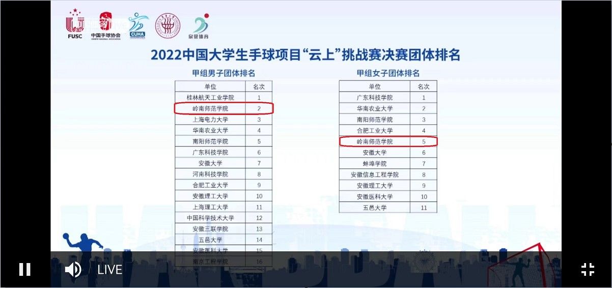 11月13日,2022年中国大学生手球项目“云上”挑战赛决赛以线上直播的形式举行。岭南师范学院代表队(男子、女子甲组)团结协作、众志成城,在激烈的竞争中杀出重围,获得了男子团体积分榜第二名、女子团体积分榜第五名。在个人单项中,有9名运动员进入决赛,并获得了“两金一银一铜”的好成绩。
