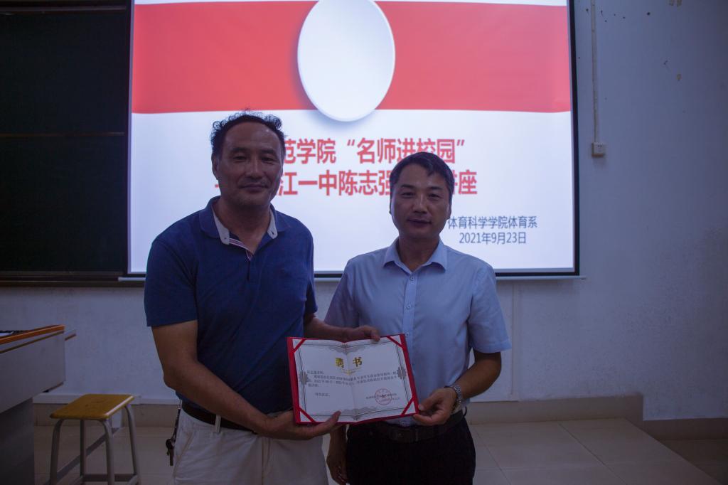 陈志强为大家带来“名师进校园”讲座。讲座从摆正心态、了解学校的情况、应知应会体育教师基本技能、实习中应注意的问题、应完成的实习任务五个方面进行讲授。陈志强指出,实习中应注意以下四点:第一,向各位老师和实习生学习,培养自己独有的教学特色;第二,尽量多向指导老师报备自己的情况;第三,注意总结,做事有始有终;第四,保持与学生的基本关系,组织活动要以安全第一为原则。