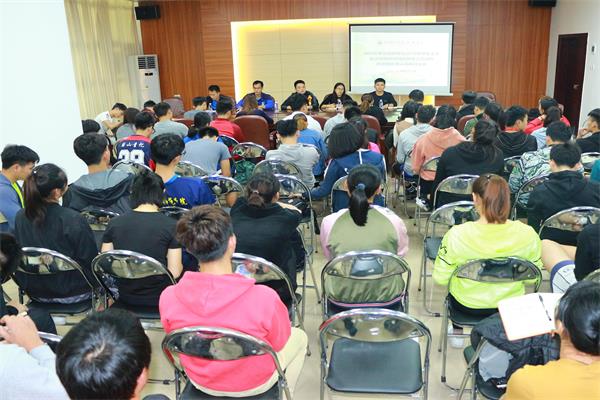 为学习贯彻学校2018年学生工作会议和学校党委黄达海副书记的讲话精神,深入探讨如何打造体科院新学工,4月8日中午,体科院在体育馆会议室召开“学习贯彻2018学生工作会议精神暨体科院新学工内涵和新岭师体育人精神讨论会”。体科院党委郑晓辉副书记、辅导员莫毅、陈静、伍文海、叶萃蓬老师以及体科院学生七大机构部长以上的学生干部参加了此次会议。