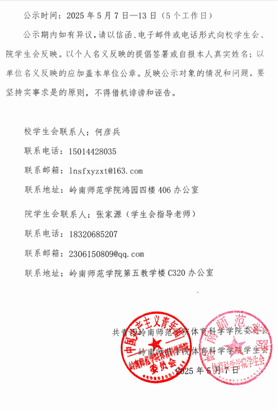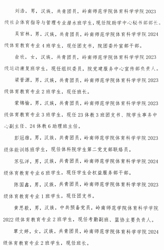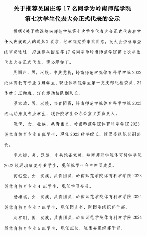 关于推荐吴国庄等17名同学为岭南师范学院第七次学生代表大会正式代表的公示