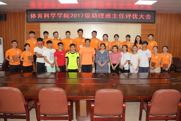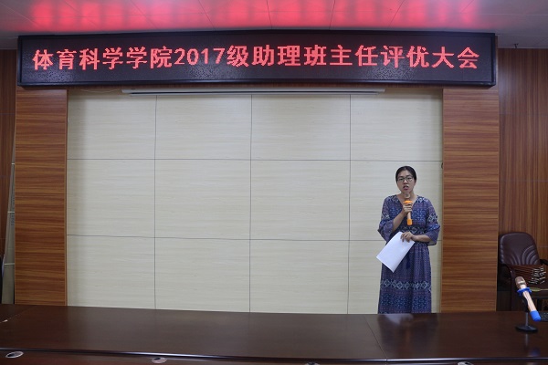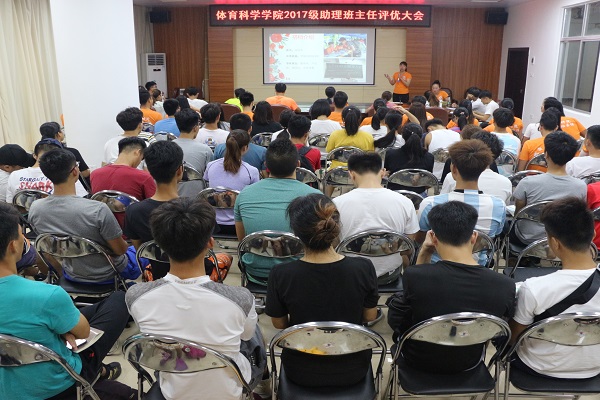 5月3日晚,体科院在体育馆会议室举办了2017级助理班主任评优大会,体科院辅导员莫毅老师、陈静老师、叶萃蓬老师,体科院七大机构负责人,意愿竞选2018级助班的同学及各班代表人出席了此次大会。本次大会由陈静老师主持。