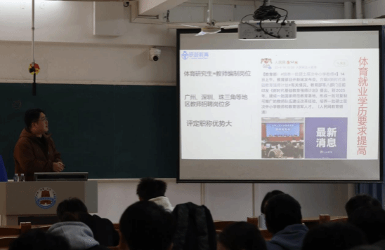 2025 年 12 月 14 日,体育科学学院于教三 - 207 教室成功举办体育专业考研专题分享会。本次分享会特邀研越考研林老师主讲,围绕体育学子考研核心需求,从备考规划、形势分析、院校选择及学习渠道搭建等方面展开全维度解读,为在场同学送上实用备考 “指南”,有效破解升学规划中的迷茫困惑。