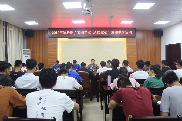 为了贯彻落实省教育厅和学校的要求,让全体师生度过一个平安的清明假期,传播文明祭扫的理念。4⽉3⽇晚,体科院在体育馆会议室举行“文明祭祀,从我做起”专题教育活动。体科院党委书副书记郑晓辉、辅导员莫毅、陈静、伍⽂海、叶萃蓬⽼师和各级班长参加了此次会议。会议由体科院党委副书记郑晓辉主持。
