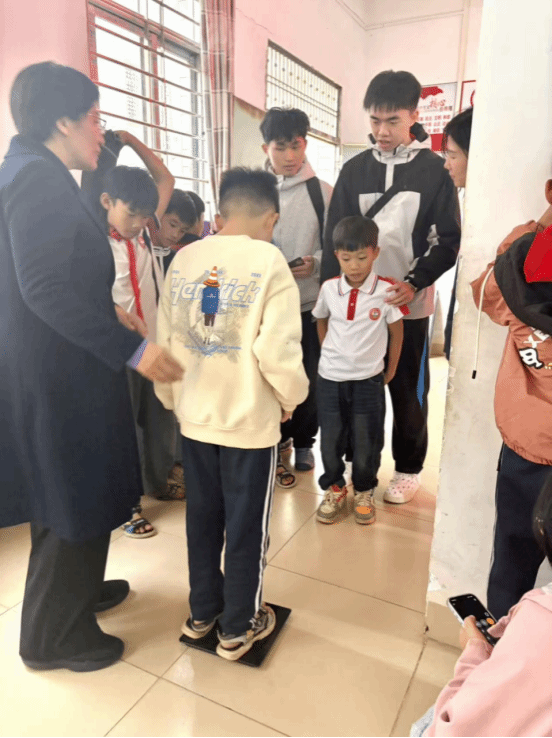 理论宣讲后,党支部的老师们发挥专业特长,现场为下洋小学的学生们进行了体质指数(BMI)测量与评估。老师们耐心地为每一位学生测量身高、体重,并计算出BMI值,同时用亲切的语言向孩子们解释测量结果,给予个性化的健康建议,鼓励他们积极参与体育锻炼,增强体魄。这项活动不仅让学校和家长对学生的身体状况有了更科学的了解,也将“体育促进健康”的理念落到实处,体现了高校教师对乡村儿童健康成长的真切关怀。