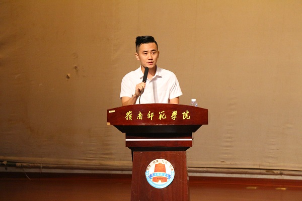 13级对外武术班黎光睿作为校友代表发言。他分享了自己的成才经历,告诫师弟师妹们一定要在大学打牢学业基础和专业技术,要积极争当学生干部,提高自己的个人能力充实自己的大学生活。15体教一班的杨康连则分享了作为一名贫困生,不仅获得国家励志奖学金,还能在学习和生活上取得如此优异的方法。要努力发掘自己的潜能,相信一切皆有可能,要明白,任何的收获都需要自己后天的付出,只有真正地努力过、付出过,才知道自己能够站得多高。
