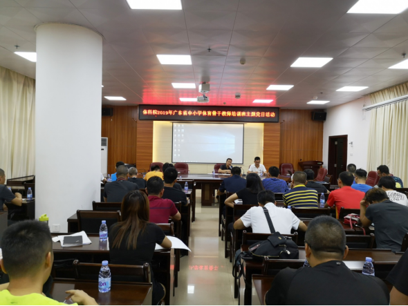 7月1日,为庆祝中国共产党98周年华诞,体育系党支部与广东省中小学体育骨干教师培训班联合开展特色党日活动,共同回顾党的丰功伟绩,展望体育教育美好未来。体科院党委书记邱飞参加活动。
