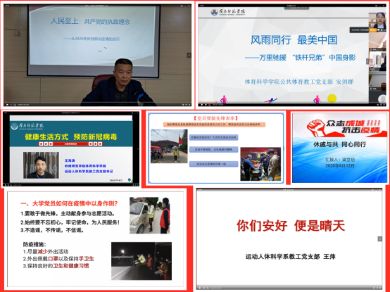 党委书记邱飞分享自己从党和国家抗击新冠肺炎工作的受到启示,阐释中国共产党的执政理念—人民至上。体育系党支部书记梁立启主要谈自己对中华民族休戚与共,同心同行的民族精神体会。运动人体党支部书记王海涛结合自身专业,为不同人群开出相应运动处方,讲解如何在疫情防控中汲取正能量,保持身心愉快。公共体育部教工党支部书记安剑群从万里驰援“铁杆兄弟”中国身影,从风雨同行,最美中国如何在全球疫情中发挥大国的责任与担当做报告。党员王萍讲述自己同学刘纯医生驰援武汉的先进事迹,传递白衣天使等逆行者榜样力量,引导党员对生命的敬重,思考人生的意义。学生党员吴颖琪、祝家耀结合自己参与村委会志愿活动谈一名大学生党员如何在抗疫中以身作则,发挥先锋表率作用。
