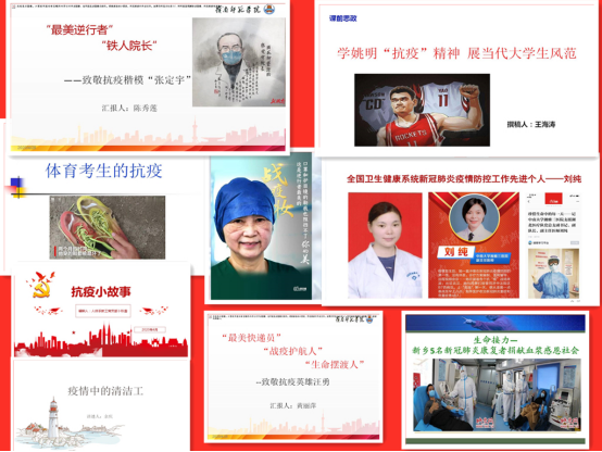 支部党员积极参与,根据身边事例或全国疫情防控中涌现的党员先进事例,制作相应PPT和讲稿,以线上支部大会形式讨论审核,完成集体备课。备课内容在学院内进行共享,线上授课时,任课教师可从共享资料“菜单”选择内容进行传达学习,每节课讲一个抗疫小事例,讲好中国故事。