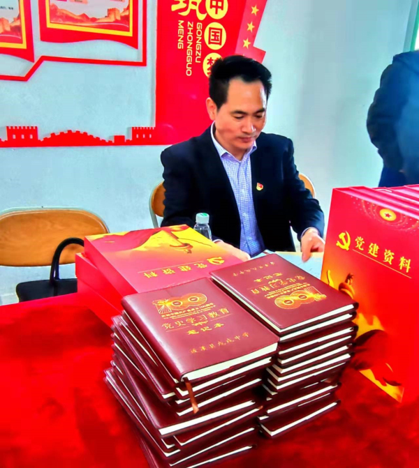 揭牌仪式后,庞景才身体力行,对戊戌中学党建材料进行阅览,并提出改进意见。