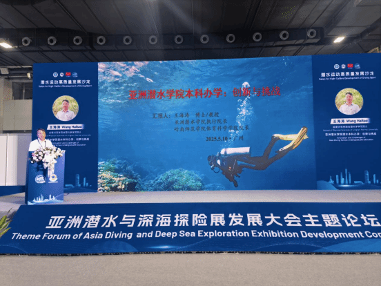 亚洲潜水与深海探险展发展大会主题论坛邀请了国家体育总局湛江潜水运动学校张征校长、广东省潜水运动协会马国川会长、亚洲潜水学院执行院长王海涛教授、广州潜水学校杨武宁主任等嘉宾,以水上运动赋能旅游强省建设、协会引领省内潜水运动发展、亚洲潜水学院潜水办学创新与挑战、休闲潜水体系与市场规范等为主题,进行了大会主旨发言。