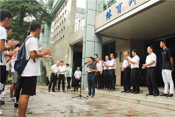 我校副校长邵乐喜,湛江市政府副秘书长林小伟,湛江市体育局局长朱陆,湛江市篮协主席、篮球协会会长吴东,湛江市篮球协会副主席张亚权,湛江市篮协秘书长范明明,我校体科院党委书记邱飞等领导嘉宾共同为湛江市篮球裁判员培训基地揭牌。