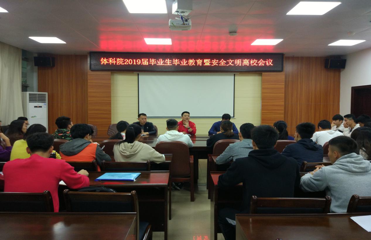 近日,体育科学学院在体育馆会议室召开体科院2019届毕业生毕业教育暨安全文明离校会议。体科院党委副书记郑晓辉、辅导员莫毅老师、伍文海老师出席会议,体科院2019届毕业班各班班长、团支书和毕业班全体党员参加了本次会议。