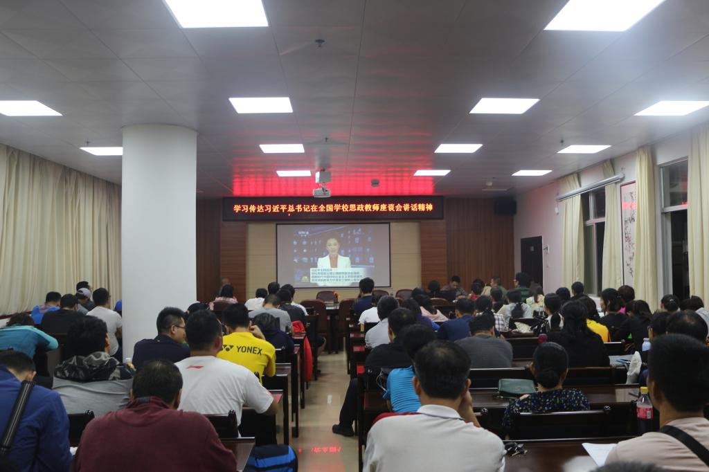 会上,大家集中收看了习总书记在思政课讲师座谈会上的讲话视频。邱飞书记强调,习总书记的讲话为高校思政课的教学改革指明了方向,要求大家不断学习。大家一致表示要在习近平新时代中国特色社会主义思想指引下,全面贯彻党的教育方针,落实立德树人的根本任务。