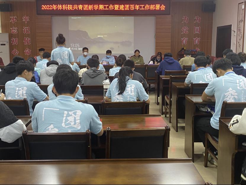 2月28日中午,体科院团委于体育馆会议室召开2022年新学期工作暨建团百年工作部署会议。出席本次会议的有体科院团委指导老师叶萃蓬、团委秘书团成员、团委全体干部以及各班团支书。会议由团委副秘书长王晓阳主持。
