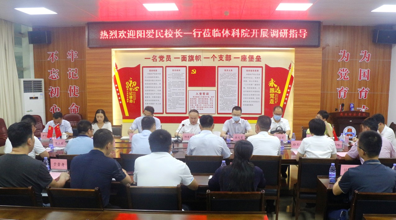 5月27日上午,阳爱民校长到体育科学学院调研。学校阳爱民校长,金义富副校长,校长办公室主任杨子江,学生处处长林志军,科学研究处处长刘群慧,人事处副处长温笑薇,教务处副处长尹宁伟,校长办公室秘书科副科长关刘君,体科院领导班子、正处级组织员以及各教学系部主任参加此次会议。