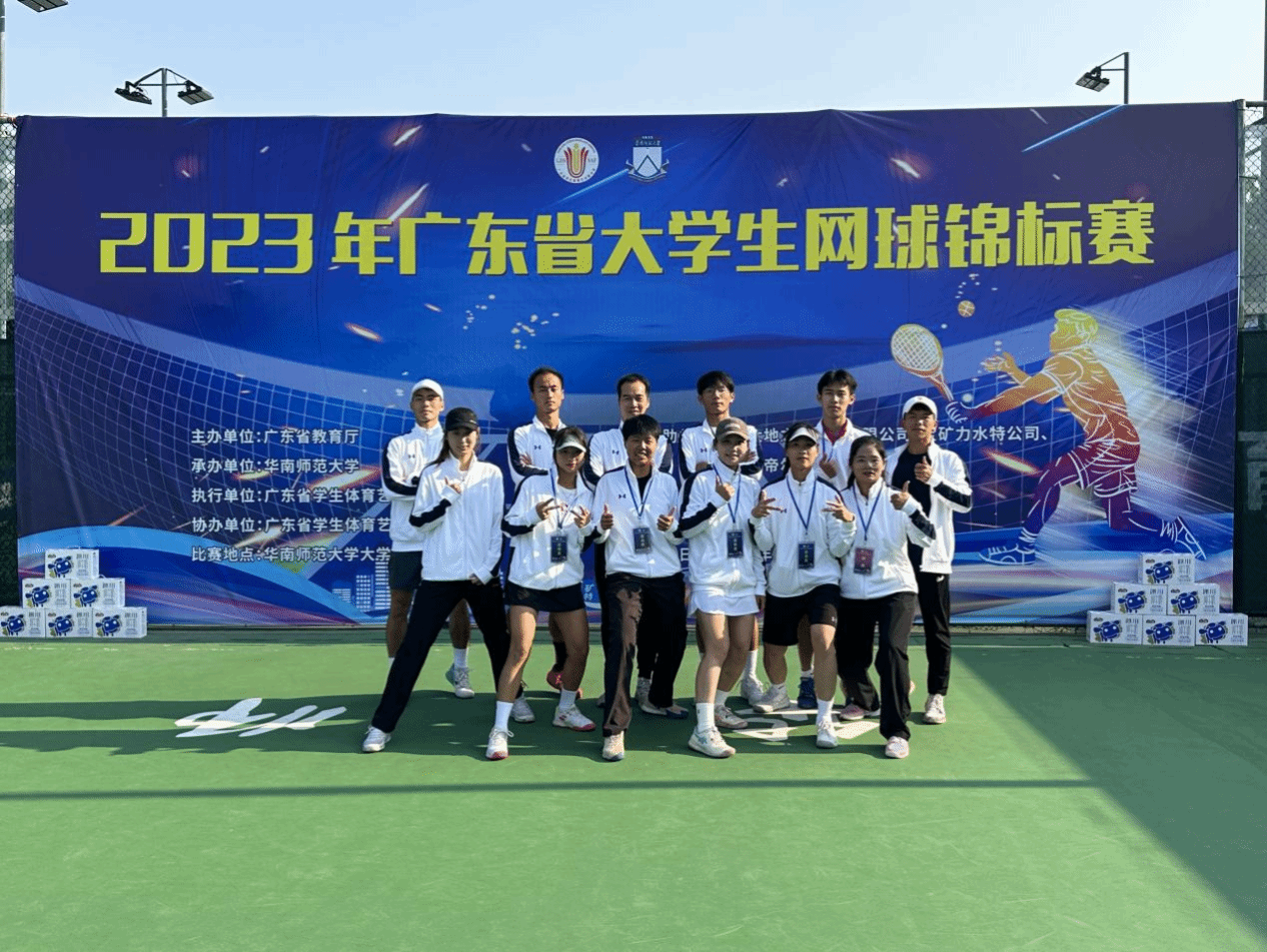 2023年11月23日至11月26日,广东省大学生网球锦标赛在华南师范大学大学城校区举行。本次大赛参加的运动员人数高达800多名,我校网球队在莫毅教练和黄凤萍教练的带队, 10名队员参加了本次比赛,共获得1银2铜,1个第四,团体总分第三名的好成绩。其中,强戈/李嘉彬男双第二名,甘君儿女单第三名,谭嘉辉/周妹混双第三。