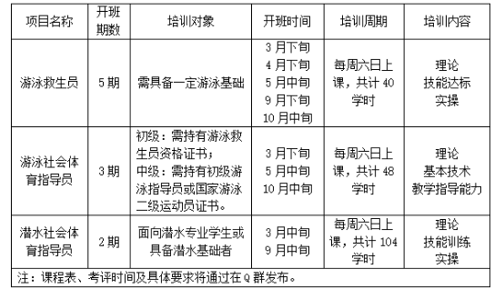 岭南师范学院于2015年获批“广东省体育行业国家职业资格培训基地”,编号:B.64003006053。现开设以下三类项目:初级游泳救生员(五级)、初、中级游泳社会体育指导员(四/五级)及初级潜水社会体育指导员(五级)。