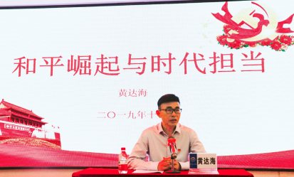在专题授课中,学校党委黄达海副书记以“和平崛起与时代担当”为主题,结合党和新中国的发展历史以及当前世界发生的一些大事件,与学员们探讨中国共产党为什么能够团结一心,实现和平崛起。他指出,中国特色社会主义进入新时代后,民族文化比以往任何一个时期都要自信,这是因为中国特色社会主义政治体制的优势带来的;对国家而言,发展才是硬道理,战争与革命并行,和平与发展共存。同时他对学员们提出两点要求:一是紧跟时事,了解国家的政治局面,坚定理想信念。二是学员们要树立起远大的志向,积极学习,努力奋斗。