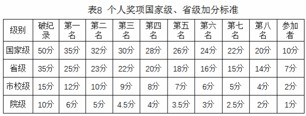 (9)院级集体奖项班级成员加分:道德风尚奖、最佳啦啦队奖、优秀班集体加1分。。其他奖项不加分。参赛队员不再加集体分。
