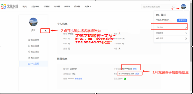 4. 登录后请自行完善修改邮箱地址、手机号等个人资料,邮箱将作为账号密码找回唯一渠道,建议务必完善;在学习过程中,学员可以通过平台随时查看自己的学习进度。