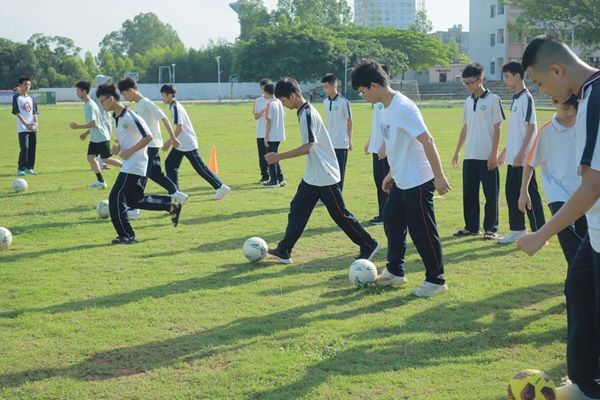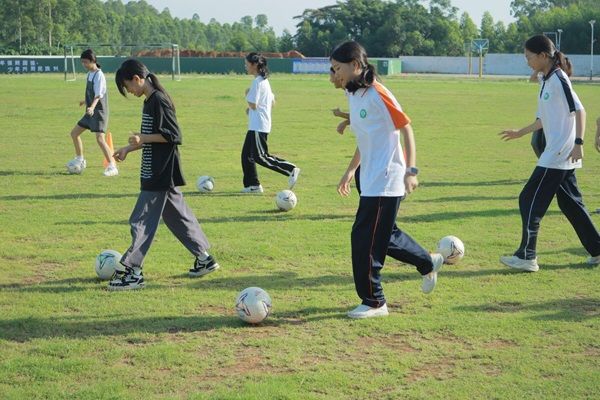 进行简单的热身后,刘老师开始讲解如何用脚内侧与脚背进行传球。同学们一边仔细观察老师的动作,一边主动尝试模仿。在刘老师的带领下,全体同学先听着口令做无球的动作分解练习,针对动作还不规范的同学,刘老师会走到面前亲自示范,并修改动作。在熟练完成完整的动作后,刘老师将同学们分为两人一组,面对面进行有球的传球练习。经过多次尝试,同学们渐渐找到了两种不同传球方式的合适力度和触球位置,让足球尽量沿着直线准确地传到对方的脚下。