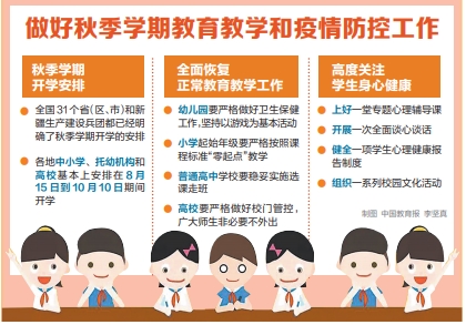 第三,早部署,部署秋季学期教育教学和疫情防控工作。8月14日,教育部印发《关于做好2020年秋季学期教育教学和疫情防控工作的通知》,要求全面恢复教育教学秩序,科学精准做好校园疫情防控,提升应急处置能力,加强领导落实责任。