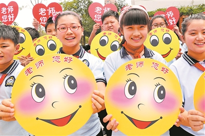 9月7日,江苏省连云港市赣榆区黄海路小学学生在展示送给老师的笑脸卡片。教师节来临之际,学生们用各种方式向老师表达节日祝福。 司伟 摄 |