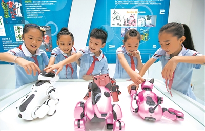 近日,江苏省海安市城南实验小学东校区的学生在参观了解“机器狗”。当日,该校组织学生前往海安机器人及智能制造科技展馆参观,通过参观和动手实践了解科学知识,乐享暑假生活。