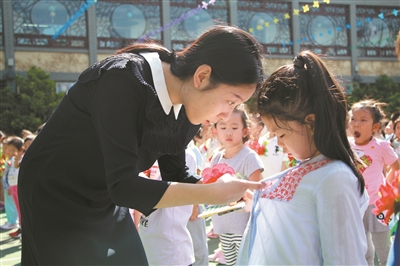 8月31日,北京市东城区光明小学开学典礼上,一年级班主任为学生整理小红花。本报记者 刘亦凡 摄